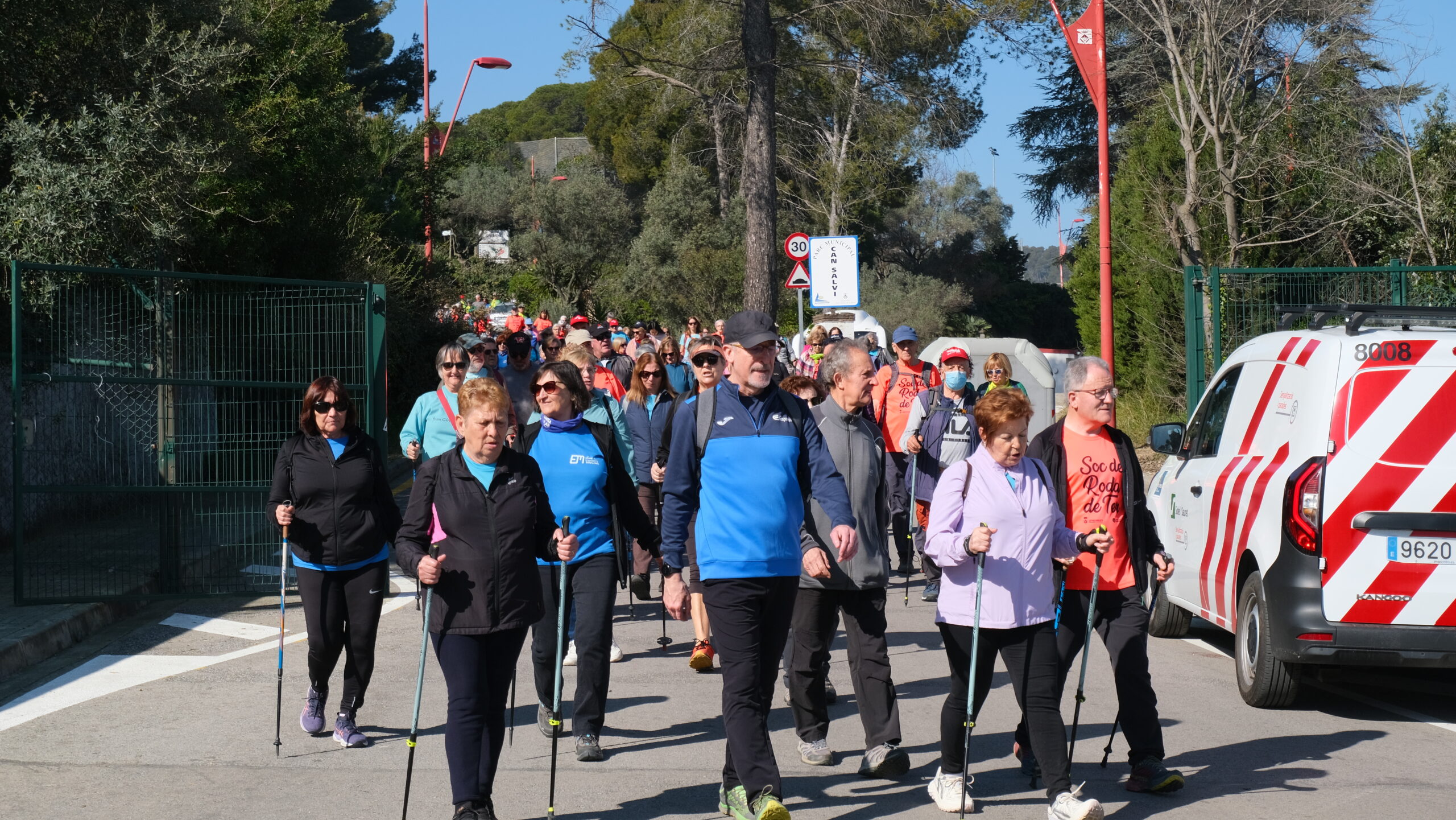 Un cop finalitzats els discursos, els centenars de participants, bastons en mà, han escalfat davant la piscina de Can Salvi i han iniciat la marxa cap avall, en direcció ermita de Santa Madrona. Des d’allà han anat fins Can Preses, per després pujar a corbera, tornar per darrere el Complex Esportiu 11 de Setembre i finalitzar la ruta circular a Can Salvi, on els assistents han fet un dinar plegats.