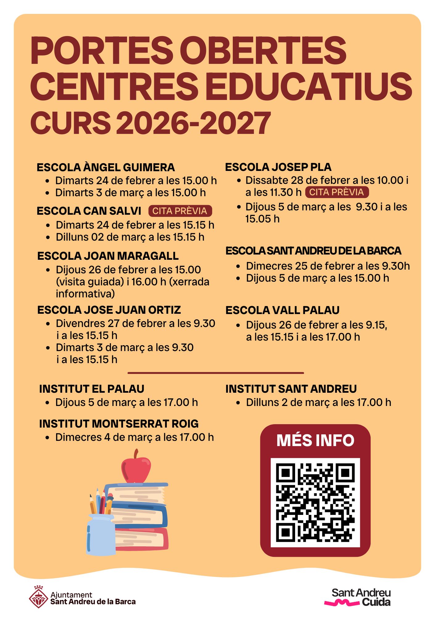 Sant Andreu de la Barca es prepara per a l’inici del procés de preinscripció escolar del curs 2026-2027 amb un ampli programa de jornades de portes obertes als centres educatius del municipi. Les visites, que es faran entre el 24 de febrer i el 5 de març, permetran a les famílies conèixer de primera mà els projectes educatius, les instal·lacions i el funcionament de cada escola i institut abans de formalitzar la sol·licitud.