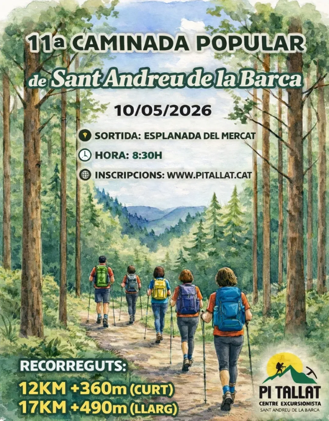 El Centre Excursionista Pi Tallat ha anunciat la celebració de l’11a Caminada Popular de Sant Andreu de la Barca, que tindrà lloc el pròxim diumenge 10 de maig. L’activitat proposa dos recorreguts, un de 12 km i un altre de 17 km, amb un i dos punts d’avituallament respectivament. L’entitat anima tothom a participar en aquesta cita ja consolidada.