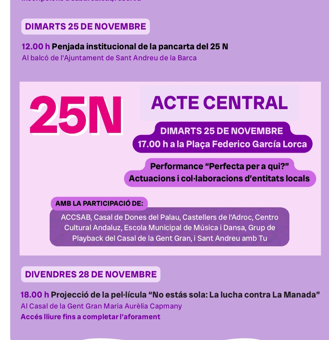 A poques hores de començar l’acte central del Dia Contra les Violències Masclistes, Sant Andreu de la Barca ha protagonitzar la penjada institucional de la pancarta del 25-N al balcço de l’Ajuntament. Un gest simbòlic pr donar el tret de sortida a una jornada carregada d’actuacions i on participan gran part del texit associatiu de la ciutat.