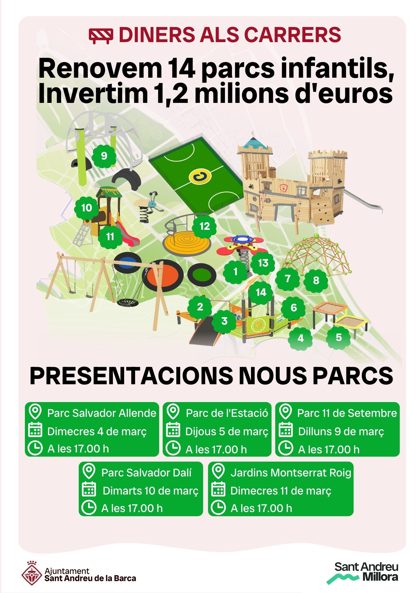 L’Ajuntament de Sant Andreu de la Barca presentarà durant el mes de març els projectes de remodelació de cinc nous parcs infantils, en el marc del pla municipal de reforma integral de 14 àrees de joc distribuïdes per tots els barris de la ciutat. La iniciativa compta amb una inversió global d’1,2 milions d’euros.