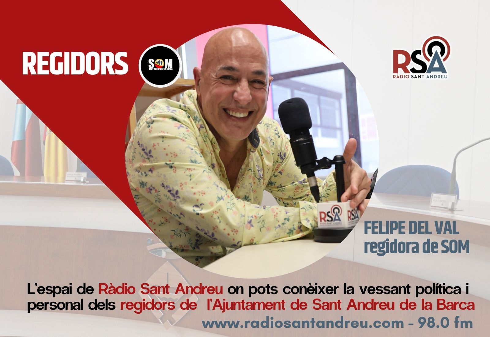 Felipe del Val, regidor de SOM ha conversat amb Jordi Milian a l’espai REGIDORS per respondre a les preguntes sobre el que suposa ser regidor a Sant Andreu de la Barca, que és o com hauria de ser la política o per què va decidir entrar en política. A més de conèixer detalls sobre la seva biografia.